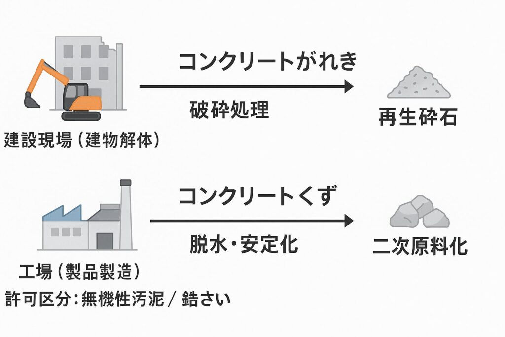 - 発生源:コンクリート製品工場など、製造工程由来の不良品・残渣・スラッジ